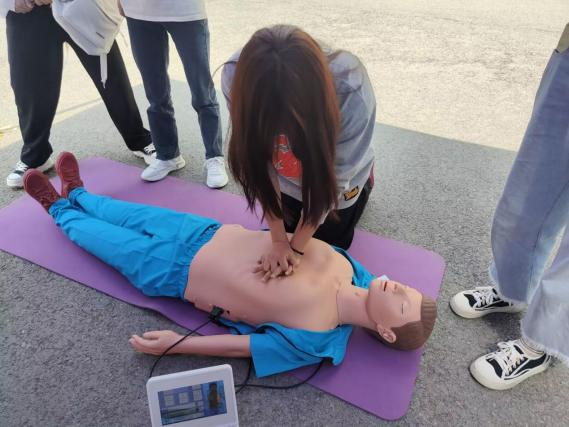 在此次大赛中,应急管理协会在现场摆放了两个配备有专业测量设备的心肺复苏假人模型,为同学们提供了较为真实且标准的模拟现场,便于同学们学习。在活动的开始,协会的小伙伴为参加活动的同学们亲自演示心肺复苏的步骤。首先正面跪在患者的侧胸位置,双手交叉互扣,掌根一字重叠,以掌跟为发力点,手指上抬,双臂绷紧垂直,上半身前倾垂直向下用力按压,双肩连线中点在按压点正上方,连续快速有力,确保胸廓充分回弹。根据所教的步骤,同学们纷纷开始了自己的实操比赛,一时之间活动现场盛况空前。不少路过的同学们也纷纷被吸引过来,认真学习应急救援知识。在同学们进行实操的过程中,协会的同学也在旁边进行指导,规范同学们的动作,尽可能以正确的做法去进行急救,参与过的同学们都表示受益匪浅。