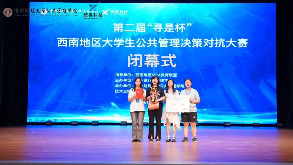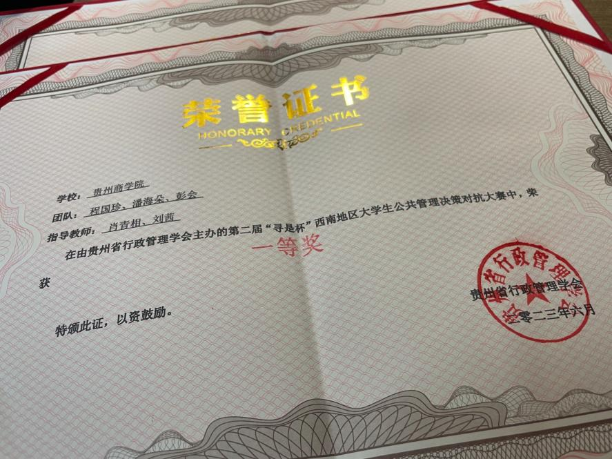 贵州商学院于2023年6月2日参加第二届“寻是杯”西南地区大学生公共管理决策对抗大赛。我院公共事业管理专业学子程国珍、潘海朵、彭会(团队)在本次比赛中荣获一等奖,取得了优异的成绩。