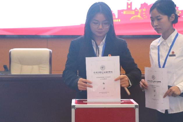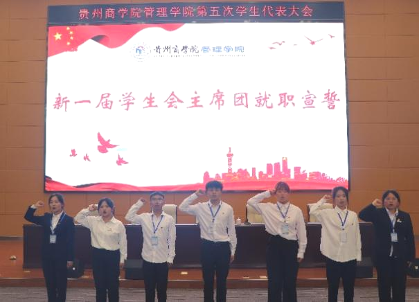 会议通过了《贵州商学院管理学院学生会章程》、《贵州商学院管理学院学生干部管理制度》和新一届学生会主席成员候选人名单。紧接着各主席团候选人上台发言,同时由全体代表通过不记名投票方式,差额选举产生了新一届学生会主席团成员。第三次全体会议公布了大会选举结果,由张娜娜带领新一届学生会主席团进行就职宣誓。会后讨论确定了管院学生会以及团总支各部门主要负责人。至此,管理学院第五次学生代表大会圆满落幕。