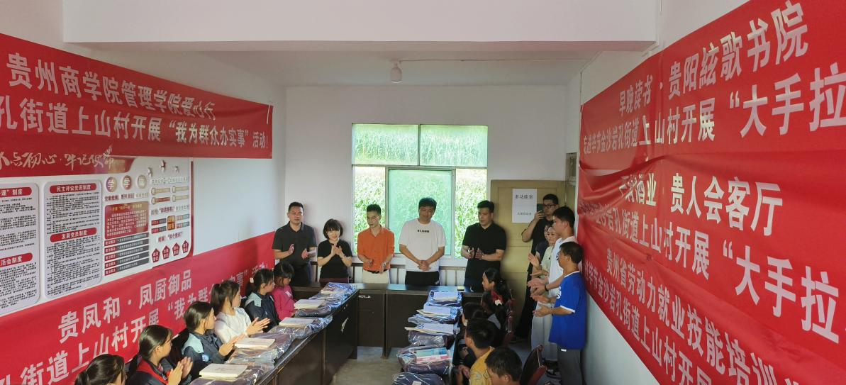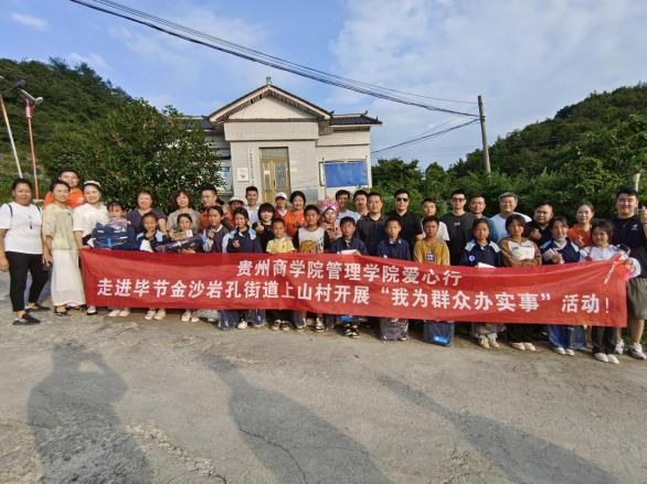 为助推主题教育走深走实,结合学校与金沙县人民政府“金品金货出山”战略合作协议相关精神,贵州商学院管理学院于7月12日启动了暑期“我为群众办实事”活动,组织了实践服务团,一是为“金品金货出山”开展调研,二是切实为帮扶点送服务办实事。7月13日由党总支书记田歆带队,党总支副书记赵翔、副院长李莉、公共管理教研室副主任肖青相等老师参加了实践队。学院携手贵凤和餐饮管理有限公司张云红总经理、严钢酒业·贵人会客厅杨远洲总经理、贵州省劳动力就业技能职业学校廖海林校长、早晚读书·贵阳絃歌书院的执行董事兼总经理叶华林先生一行走进毕节金沙岩孔街道上山村开展“大手拉小手,我为群众办实事”活动。本次活动由上山村驻村书记闵远威书记主持。