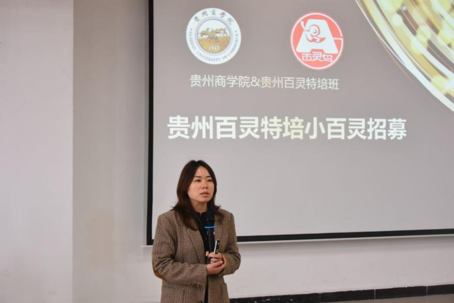 招募宣讲伊始,李琦对贵州百灵企业集团的概况、文化、产品销售等进行了介绍。同时,对企业培养人才的目标、计划、要求做出了阐述,她强调在当今浮躁的时代下,贵商学子应发扬特别能吃苦、特别经折腾、特别能坚持的优良作风,要为贵州经济的发展贡献自己的一份力量。