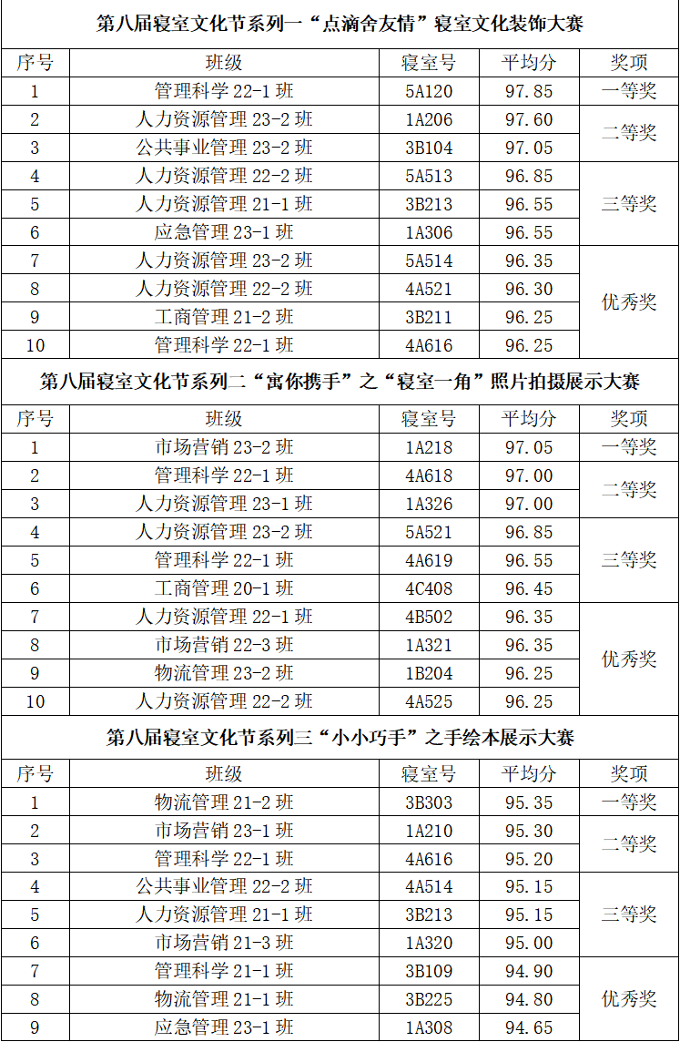 本次寝室文化节活动分为四个系列活动,即“点滴舍友情”寝室文化装饰大赛、“寓你携手”之“寝室一角”照片拍摄展示大赛、“小小巧手”之手绘本展示大赛、“爱国卫生月”主题班会学习活动。学院始终坚持公平、公开、公正的原则组织开展本届寝室文化节系列活动,通过大众评选进行投票或打分。在活动中涌现出了一批表现优秀的寝室,评选获奖名单如下图所示。