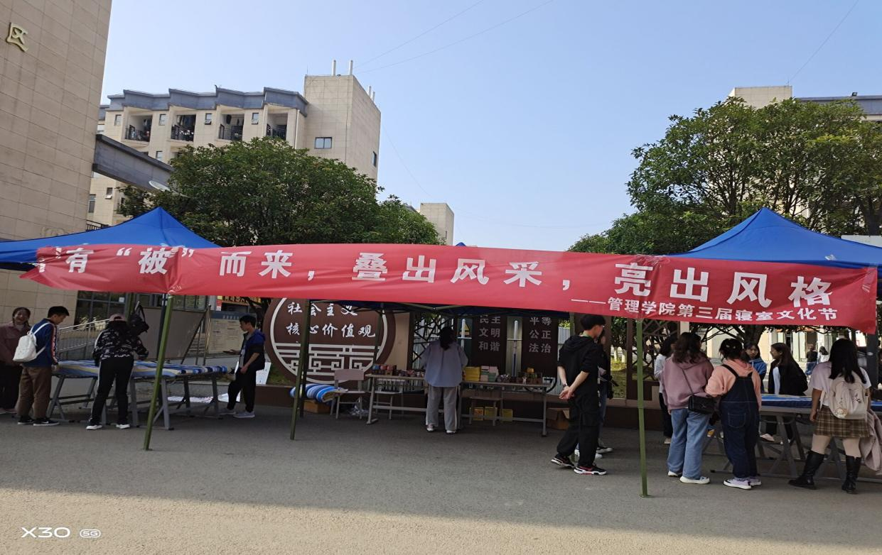 为进一步增强学生文明卫生意识,规范宿舍管理,创造舒适、温馨的宿舍生活环境,提高学生内务整体水平, 2021年4月21日,管理学院第三届寝室文化节“爱国、爱卫生、爱自己”活动系列三之趣味叠被子比赛在丹桂苑A区与玉桂苑A区之间空地举行。在日常的管理中,管院就很注重学生的内务整理,提出严格的要求,进行具体的指导,如学生会生活权益部每周五大检时要求被子叠成豆腐块等。