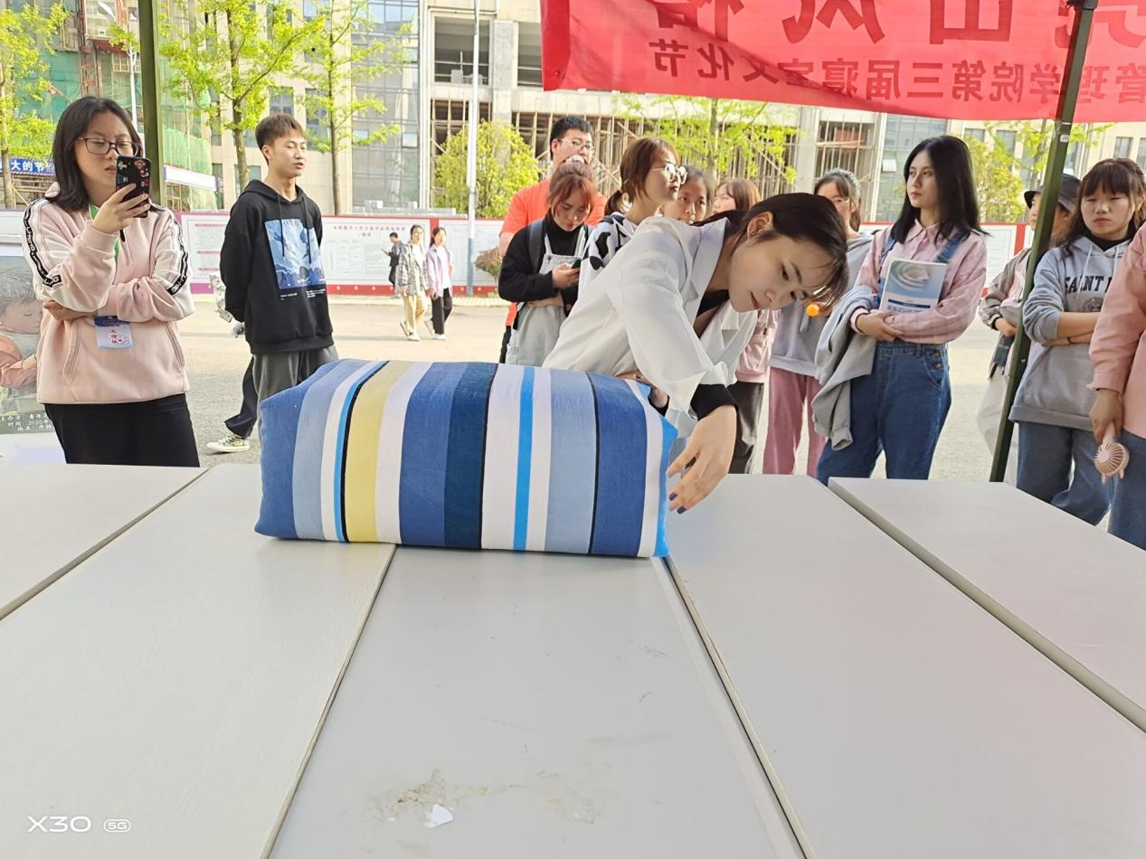 活动现场,主办方为选手们准备了丰厚的奖品,吸引了不少同学参与进来,很多叠被大神们大展身手,在规定的时间里把被子叠成一块块豆腐块,拿走了本次活动所准备的精美礼品。他们不仅展现了管院学生的风采,也让本次活动从一开始就进入了高潮。