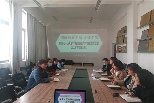 2021年3月15日下午14:30,会计学院和国际教育学院在尚信楼B514会议室,就进一步加强学生管理工作开展了学习交流会。交流会由会计学院党总支副书记唐恬主持,国际教育学院党总支副书记徐琴,会计学院部分专职辅导员,国际教育学院专职辅导员和兼职班主任参加此次交流会。