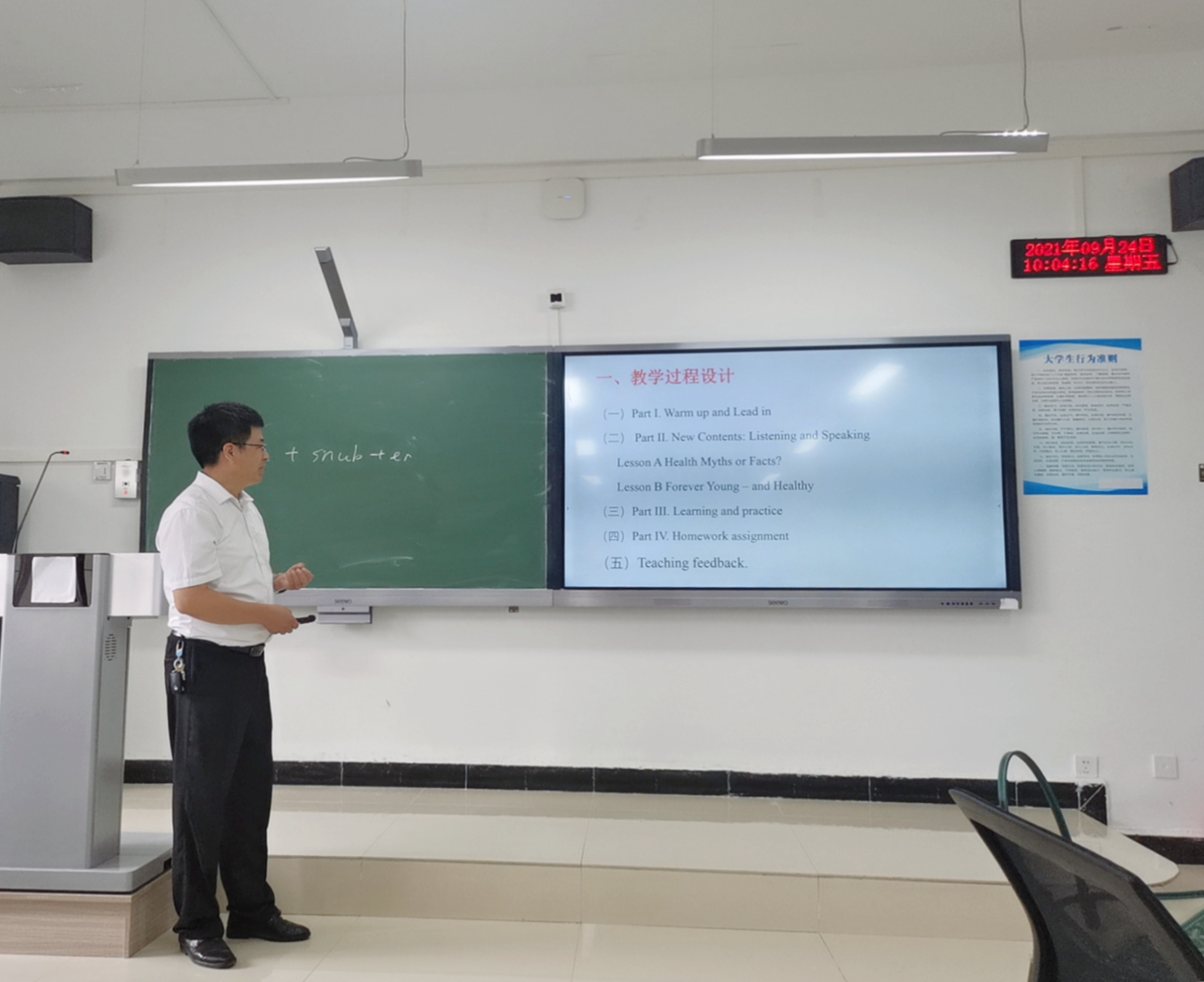 2021年9月24日上午,为了迎接即将到来的2021年教育部本科教学工作合格评估,大学外语教学部公共外语教研室第二教研组举办了迎评估说课教学活动,活动由商务英语教研室主任张晓华教授主持。