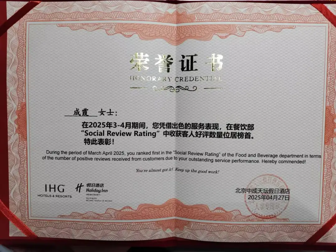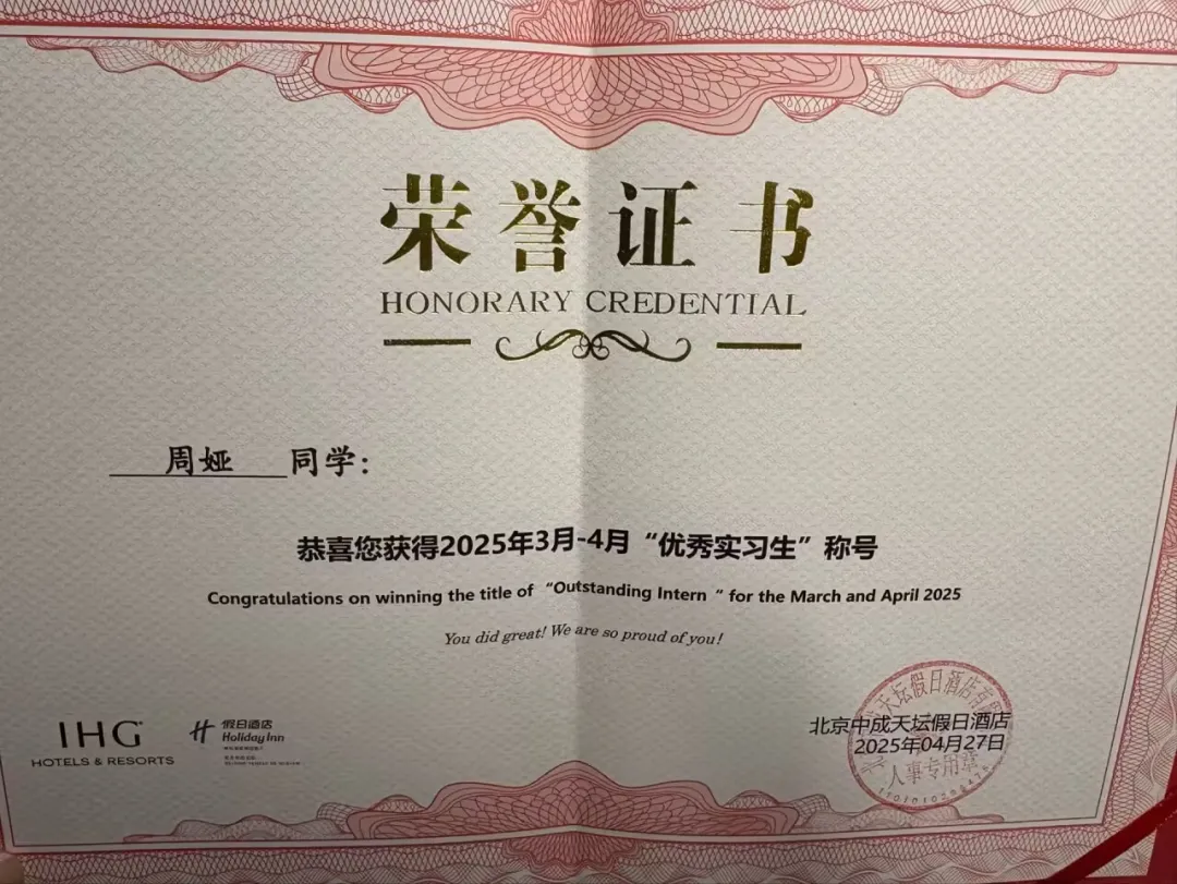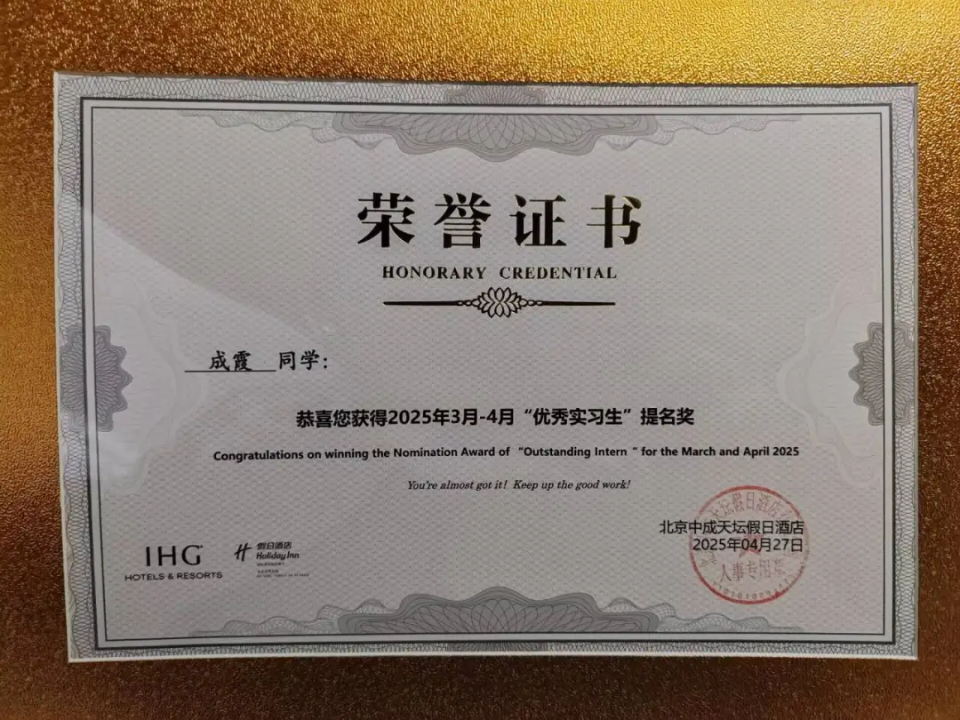一份耕耘,一分收获。旅游管理学院酒店管理22-1班周娅、酒店管理22-2班成霞凭借着专业知识和技能,秉承着积极进取的精神,获得北京中成天坛假日酒店3-4月的优秀实习生获奖者和提名者。