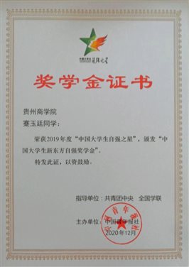 近日由共青团中央全国学联主办2019年度中国大学生“自强之星”奖学金名单公布,我校胡明晨、蹇玉廷同学荣获中国大学生“自强之星”奖学金。