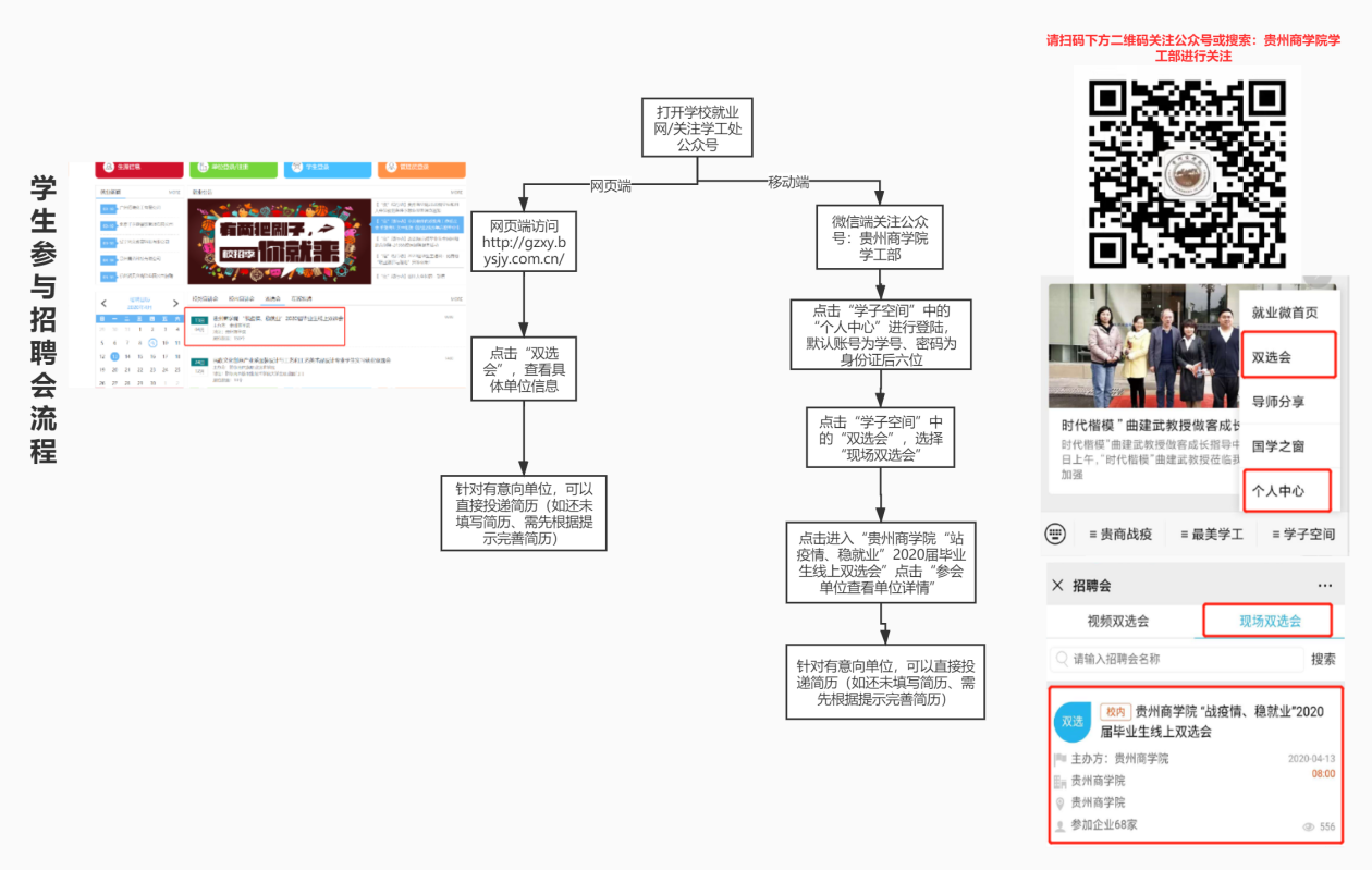 学院定于2021年2月28日-3月15日举办“贵州商学院2021年线上双选会(第一场)”。请各二级学院通知毕业生通过“学院招生就业信息网”@/upload/files/2021/8/35089a4322eb872f.cn 或通过手机搜索“贵州商学院学工部”微信公众号进行线上应聘。请2021届毕业生们认真对待每一次选择,线上双选既是一次对自己的挑战、检验,也是在特殊形势下作为贵商青年大学生对市场变化、经济形势发展的一次较好社会认知以及对自己的职业发展的一次较为真切的思考机会。