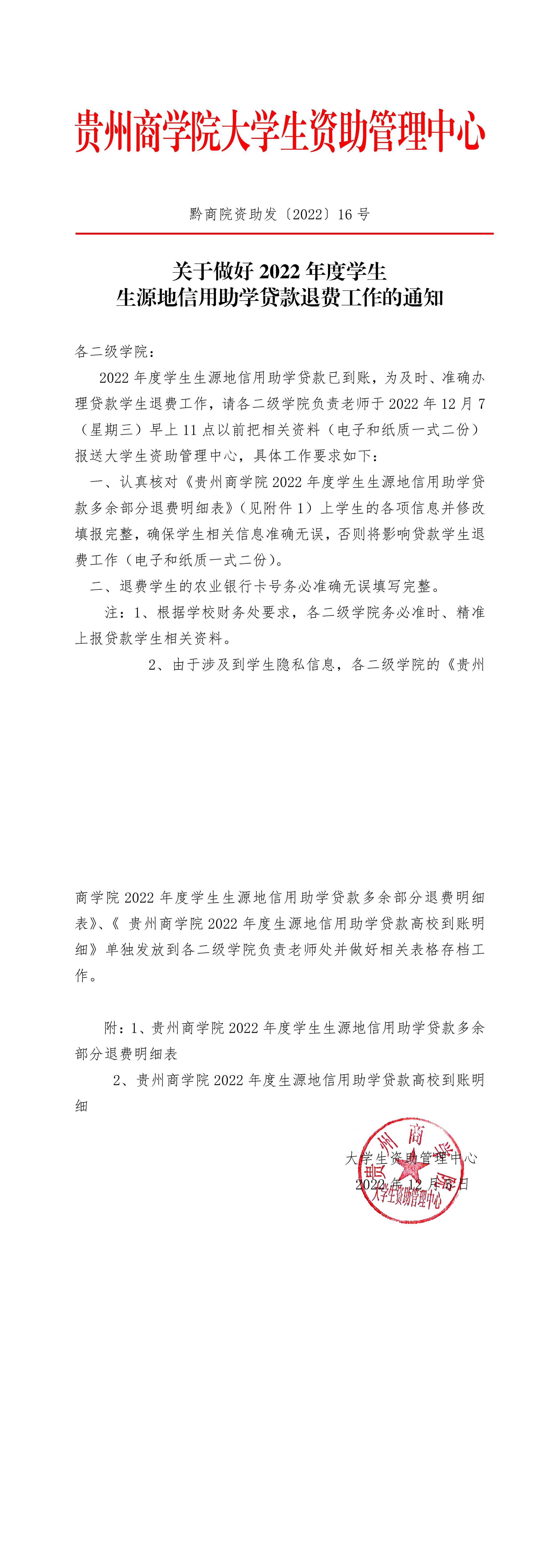 关于做好2022年度学生生源地信用助学贷款退费工作的通知 黔商院资助发〔2022〕16号