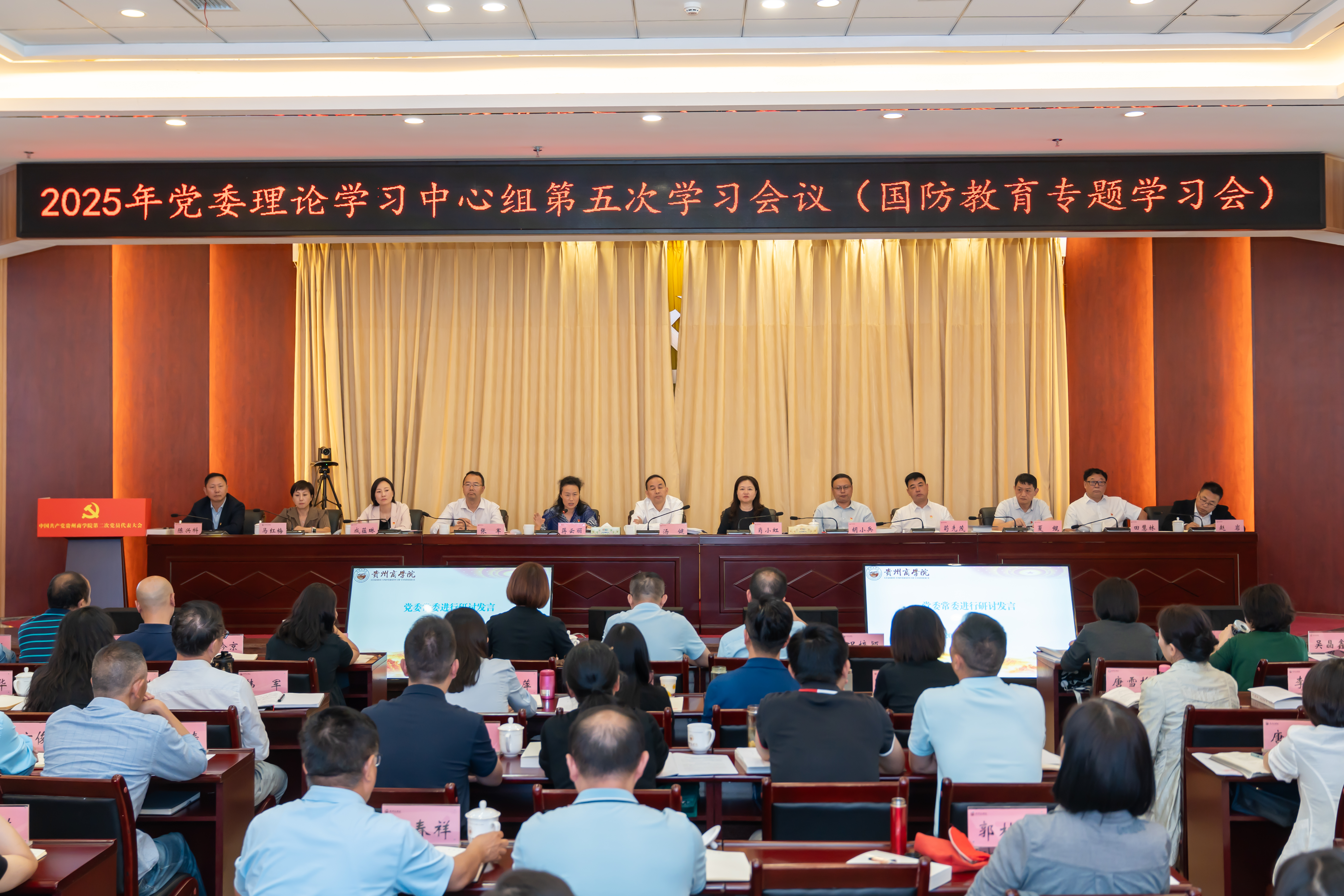为铭记光辉历史、铸牢国防观念、发扬伟大抗战精神,深学笃用《习近平谈治国理政》第五卷,更加深刻把握习近平新时代中国特色社会主义思想的丰富内涵和实践要求,10月10日下午,贵州商学院党委在静心湖会议中心报告厅召开2025年党委理论学习中心组第五次学习会议(国防教育专题学习会)。党委书记汤健主持会议并讲话。党委副书记、校长肖小虹,党委副书记蒋云丽、胡小兵,党委常委、副校长张军、苟先茂、成蕴琳,党委常委、纪委书记、监察专员夏鲲,党委常委、副校长马红梅,副厅长级干部田慧林,党委常委、党委组织部部长陈兴科,党委常委、党委宣传部部长、党委统战部部长赵岩出席会议。