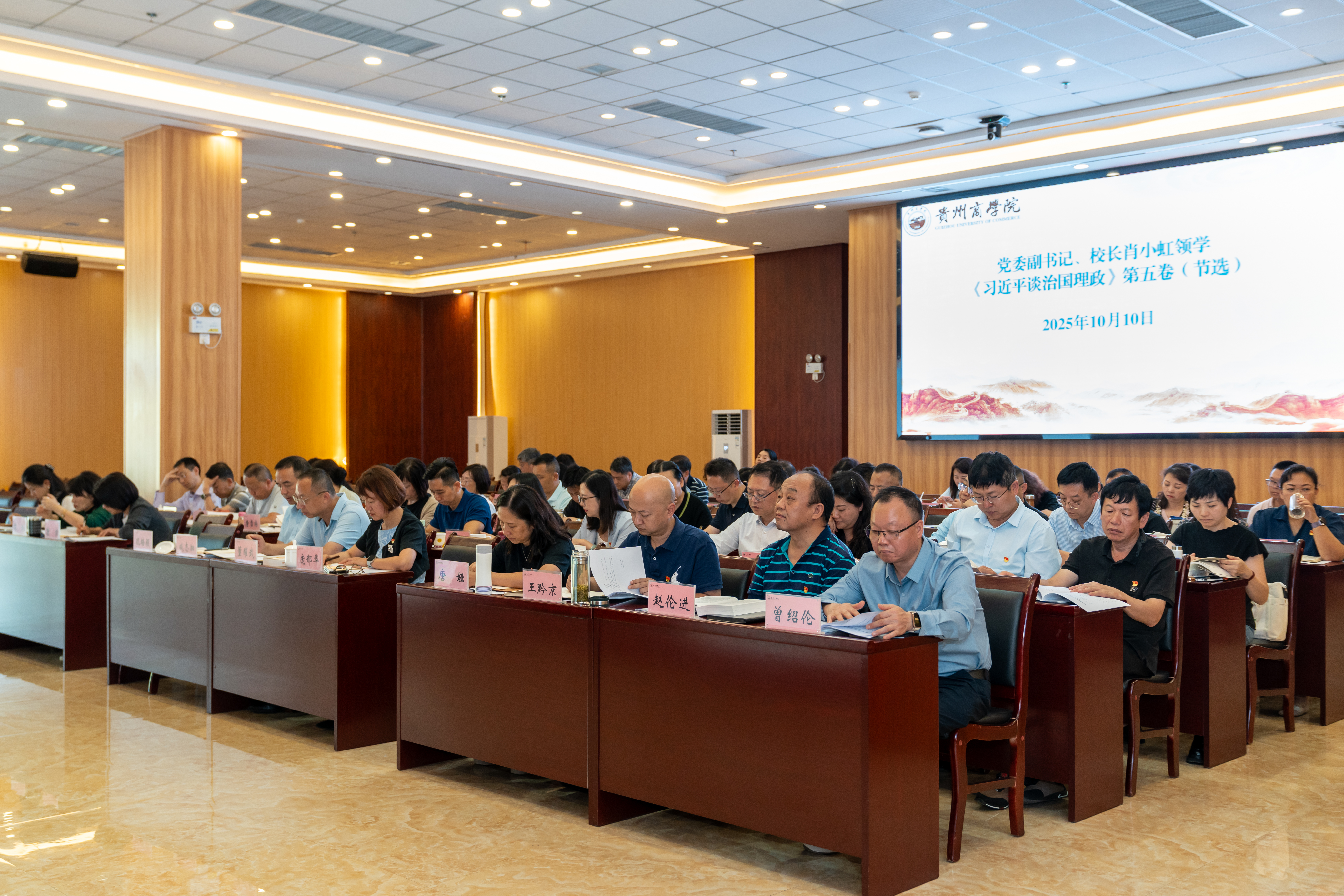 汤健强调,学好用好《习近平谈治国理政》第五卷是当前和今后一个时期的重大政治任务。全校上下要把学习《习近平谈治国理政》第五卷与学习前四卷结合起来,与贯彻落实习近平总书记在贵州考察时的重要讲话精神以及关于教育的重要论述紧密结合起来。校领导班子成员必须以更高站位、更实举措、更强担当发挥引领示范作用,推动理论学习从“有形覆盖”向“有效覆盖”转变,真正让治国理政精髓入脑入心。各级党组织要切实履行主体责任,把学习《习近平谈治国理政》第五卷作为加强党的建设、推动学校高质量事业发展的重要抓手。各二级学院要推动《习近平谈治国理政》第五卷精神内涵进教材、进课堂、进头脑,将《习近平谈治国理政》第五卷的精神内涵转化为课堂教学的鲜活素材。要依托实践教学环节,组织学生围绕书中理论开展实地调研、社会服务,让学生在实践中直观感受治国理政思想的实践伟力,切实让课堂成为理论阐释、思想启迪的主阵地。