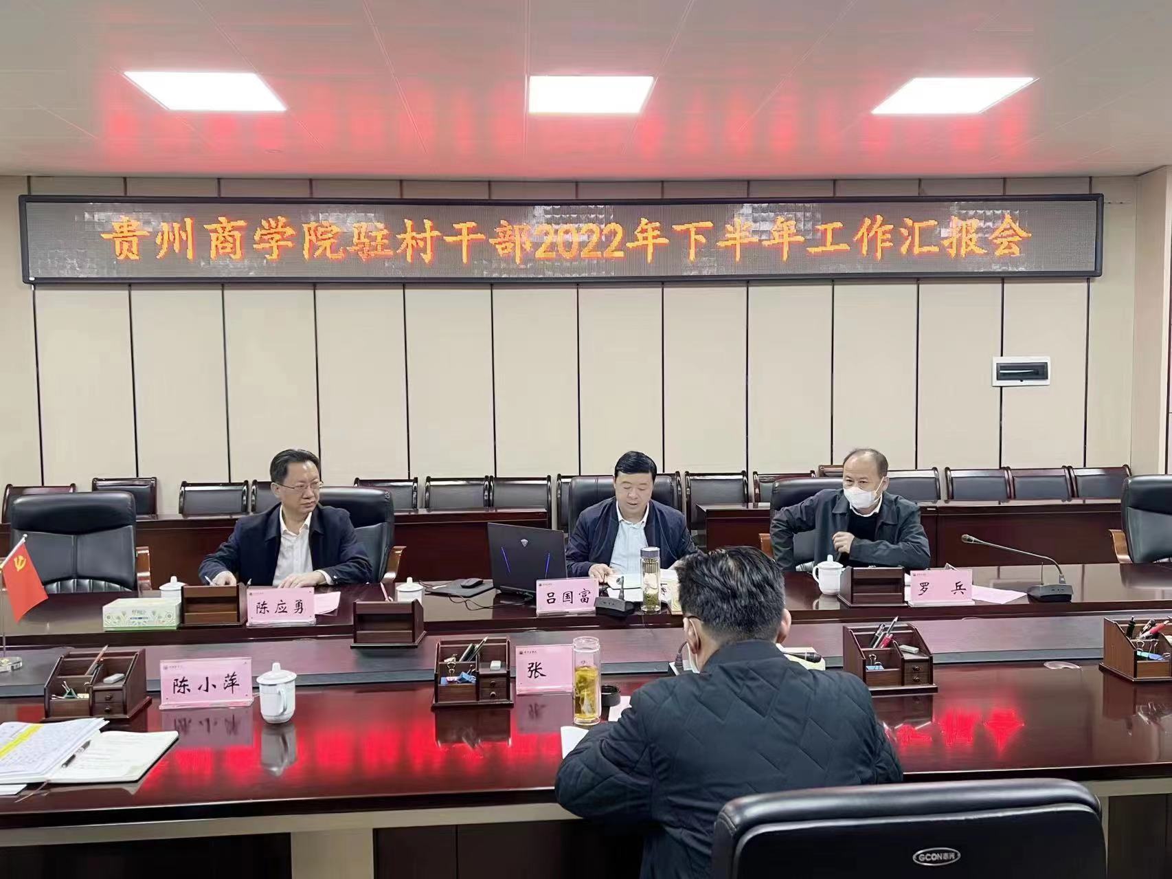 驻村第一书记、驻村工作队队员韩琰、赖井林、陈辉、许奕、闵远威、冷云、王伟、田培琪、吕立分别汇报了近期驻村工作推进情况,重点汇报了驻村点在当前产业发展、乡村基础设施建设等方面存在的问题和困难。在听取了大家的汇报后,吕国富书记对驻村干部认真履行驻村工作职责、积极投身助推乡村振兴伟大事业、坚守抗击新冠病毒疫情一线表示充分肯定。他强调,驻村干部要进一步发挥桥梁纽带作用,充分利用学校在科研和人才优势,围绕商科专业特色,结合驻村点实际,想办法、出实招,在进一步深化学校和金沙县的校地合作上,在助推金沙县优质特色农产品“金品金货出山”上有更大的作为和成效,奋力写好“乡村振兴”这篇大文章。