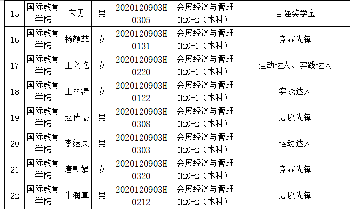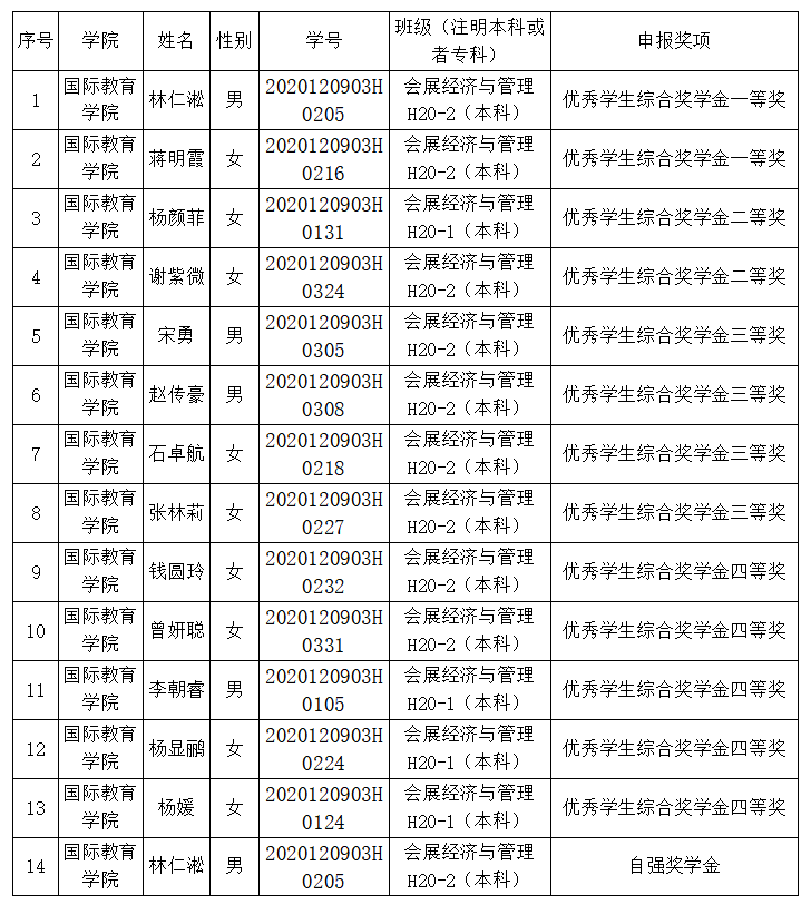 根据根据《贵州商学院学生院内奖学金评选办法》黔商院发〔2021〕54 号文件要求的有关规定经院级评议,国际教育学院推荐优秀学生综合奖学金13名,自强奖学金2名,校园先锋达人奖学金7名,名单公示如下: