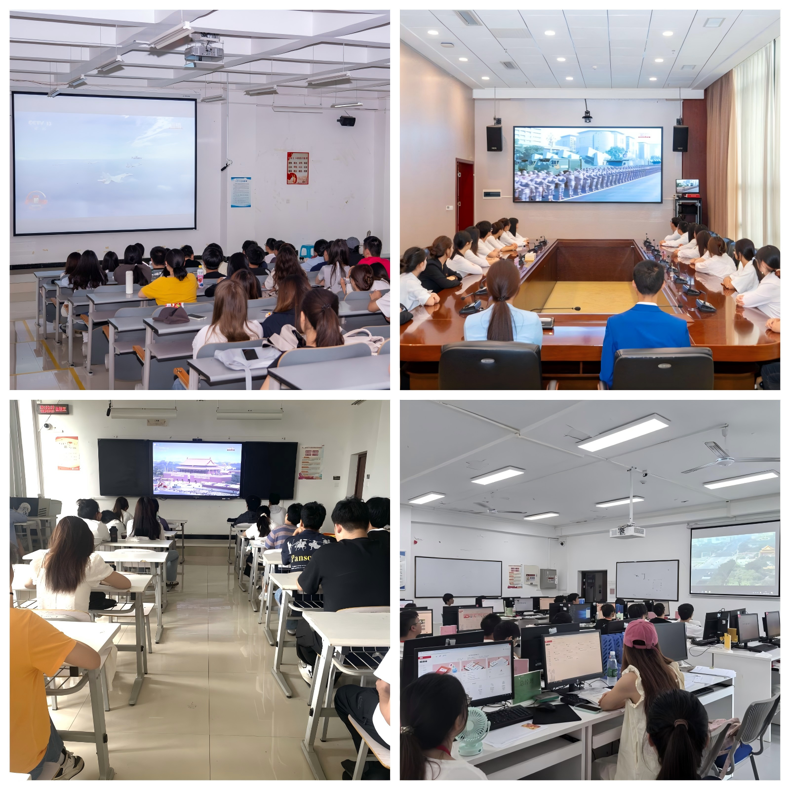 9月3日上午9时,学校党委领导班子成员和全体教职工生齐聚在静心湖会议中心和各教学楼教室,共同收看纪念中国人民抗日战争暨世界反法西斯战争胜利80周年大会现场直播,退休老同志和无课老师以不同方式收看大会。当激昂嘹亮的国歌响起时,现场师生全体起立,齐唱国歌,会场一片肃然。当习近平总书记的检阅车从天安门城楼缓缓驶出,现场气氛再度高涨,活动室里响起了雷鸣般的掌声。在整个直播中,师生们热烈的掌声和激动的欢呼声不绝于耳,此起彼伏。