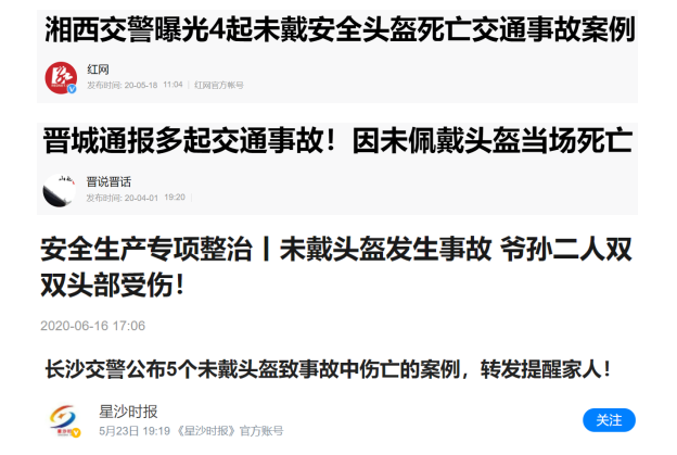 据统计,摩托车、电动自行车、小汽车是导致交通事故死亡最多的车辆。研究显示,非机动车驾驶人在交通事故中受伤和死亡的重要原因之一是头部受伤,其中有四分之三以上的致命伤发生在头部。但如果使用了安全头盔,则能有效减少头部伤害。