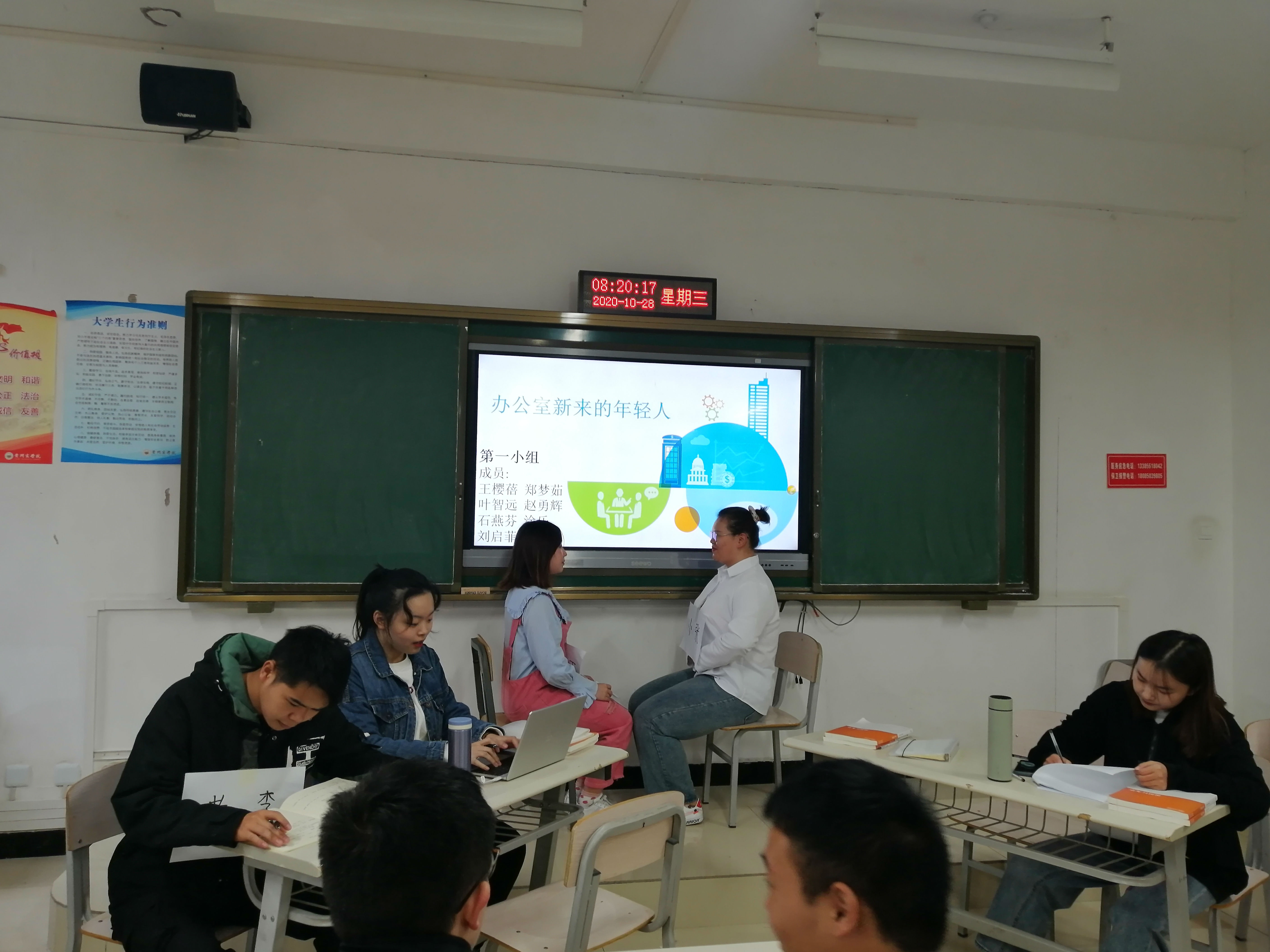 本学期第9周(10月28-30日)市场营销2017级、工商管理专业2018、2019级和人力资源管理2019级《组织行为学》教学中,张淑敏教授以班级为单位,将第三章群体心理与行为这一版块的核心知识框架,尤其是社会角色意识完美贯穿全章,通过情景剧教学(表演)有的放矢地开展课程思政,实现学习过程“知道-学到-悟到-做到-得到”五步落地法。所谓情景剧教学,就是以专业教学理论为依据,以教师为主导学生为主体,根据教材内容、成熟案例和社会热点事件,由学生自行分组自编自创自导自演话剧小品等情景剧,编剧排演和表演情况进行评价的一种教学方式。利用课上分享全体学生参与,最后由师生共同结合教学内容点评(互评),挖掘亮点,摒弃污点,帮助学生明辨是非,扬善贬恶,弘扬正气。