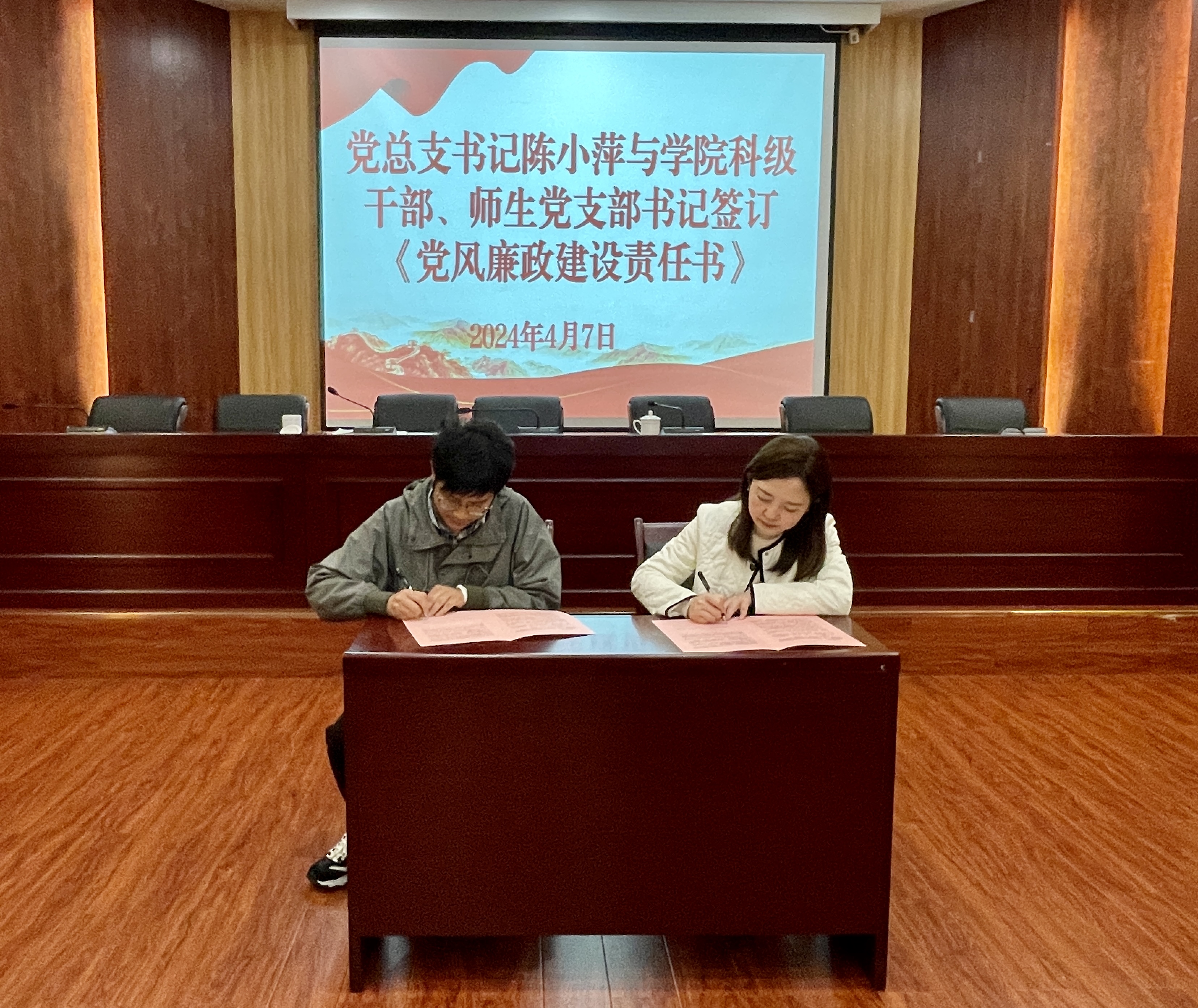 会议组织学习了习近平总书记关于党风廉政建设和反腐败斗争重要论述、学校党委书记吕国富同志在我校2024年全面从严治党暨警示教育大会上的讲话,陈小萍与学院科级干部、师生党支部书记签订《党风廉政建设责任书》。