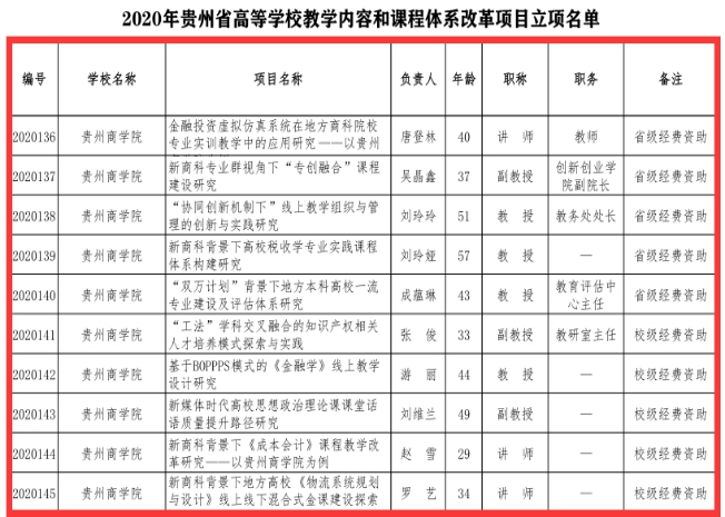 根据《省教育厅办公室关于开展2020年度省级教学内容和课程体系改革项目立项推荐工作的通知》(黔教办函〔2020〕71号)要求,省教育厅对各申报项目进行了审查,本次共立项300项,各校立项情况见附件。其中我院获得2020年度省级教改立项项目共计10项,具体立项情况如下: