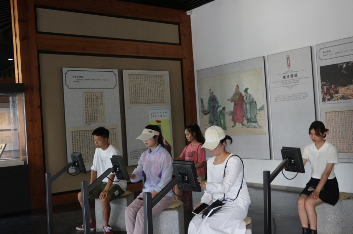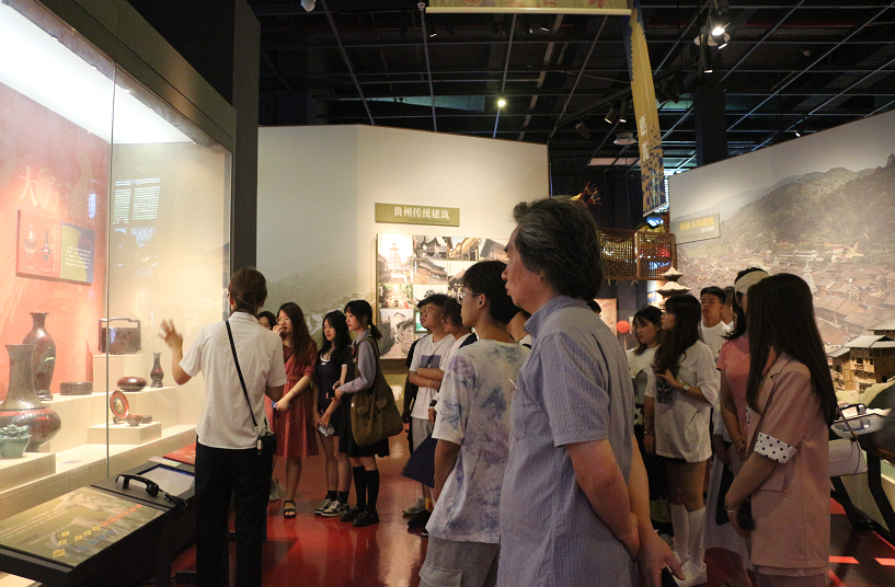 上午9时,全体师生抵达贵州省非物质文化遗产保护中心,参观了贵州省非物质文化遗产博览馆展示厅。在讲解员刘老师的带领下,同学们领略了黎平侗族大歌、石阡说春、侗族木构建筑、苗寨吊脚楼、安顺屯堡建筑、大方漆器、牙周陶器、苗绣、水族马尾绣、蜡染、印染、扎染、苗族剪纸、水族剪纸、苗族银饰、苗族芦笙、布依族勒尤、德江傩堂戏、苗族医药、水族医药、瑶族医药、布依族医药、苗族独木龙舟节、苗族栽岩习俗、苗族古藏节、侗族月也、苗族姊妹节、苗族跳花节、水族端节、水书等非物质文化遗产的魅力。在参观完贵州省非物质文化遗产博览馆以后,刘老师通过微课给同学们讲解了非遗的概念级种类,并对牙周古陶、黄平泥哨、丹寨古法造纸、彩绘桐油纸伞、三穗竹编等非遗工艺的具体制作过程进行了详细的讲述。课程结束后,同学们在贵州省非物质文化遗产展览馆穿传承厅与非遗技艺传承人近距离接触,体验交流非物质文化遗产项目,此举让同学们对贵州省非遗项目有了更为直观的认识。
