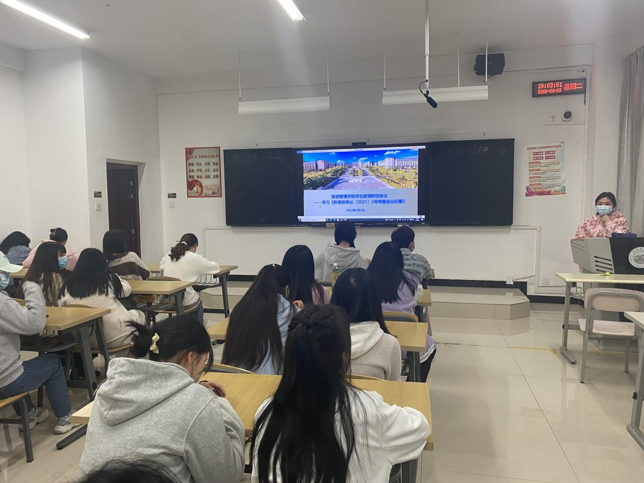 为进一步深入学习贯彻习近平总书记关于疫情防控工作的重要指示精神,抵抗病毒,强化预防优先,打造健康环境,创造一个整洁、舒适、安全的学习、生活环境,2022年4月5日,旅游管理学院全体在校班级在各班责任教室开展了“学习《黔商院专议〔2021〕2号专题会议纪要》”的主题班会。