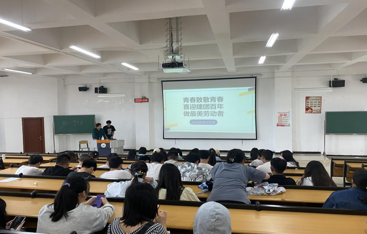 为全面贯彻党的教育方针,以昂扬姿态喜迎中国共产党第二十次全国代表大会,同时也为培育时代新人,引导当代大学生正确认识时代责任和历史使命,正确认识中国特色和发展大势,传承红色基因, 弘扬爱国之情,砥砺强国之志,将社会主义核心价值观内化于心外化于行。旅游管理学院组织在校班级在5月陆续开展了主题为“青春致敬青春,喜迎建团百年,做最美劳动者”、“一滴水,一粒米”、“以爱之名 向阳绽放”的3个主题班会。