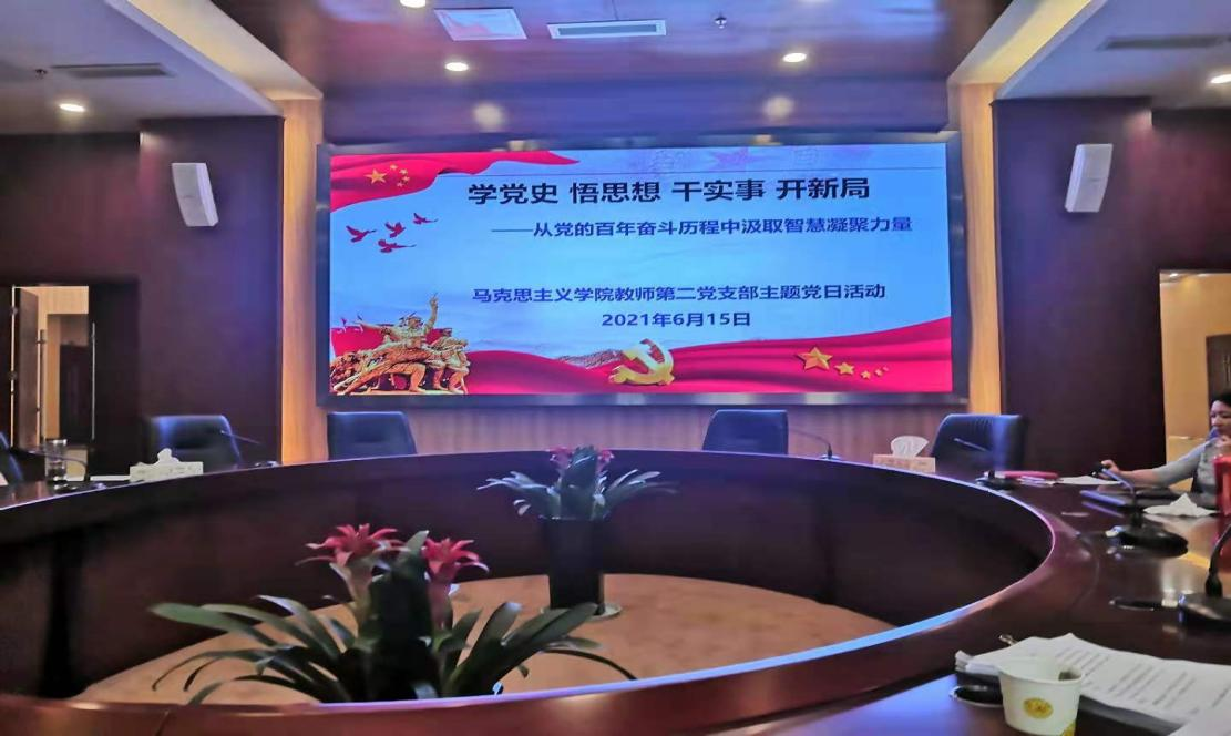 为了使广大党员了解党的历史、不忘党的初心、牢记党的使命,真正做到学史明理、学史增信、学史崇德、学史力行,6月15日下午3时,马克思主义学院教师第二支部在静心湖第一会议室举行主题党日活动。党总支副书记、支部党员周莹主持会议。支部全体党员参加活动。党委组织部、直属第四支部等兄弟支部党员代表到会观摩。