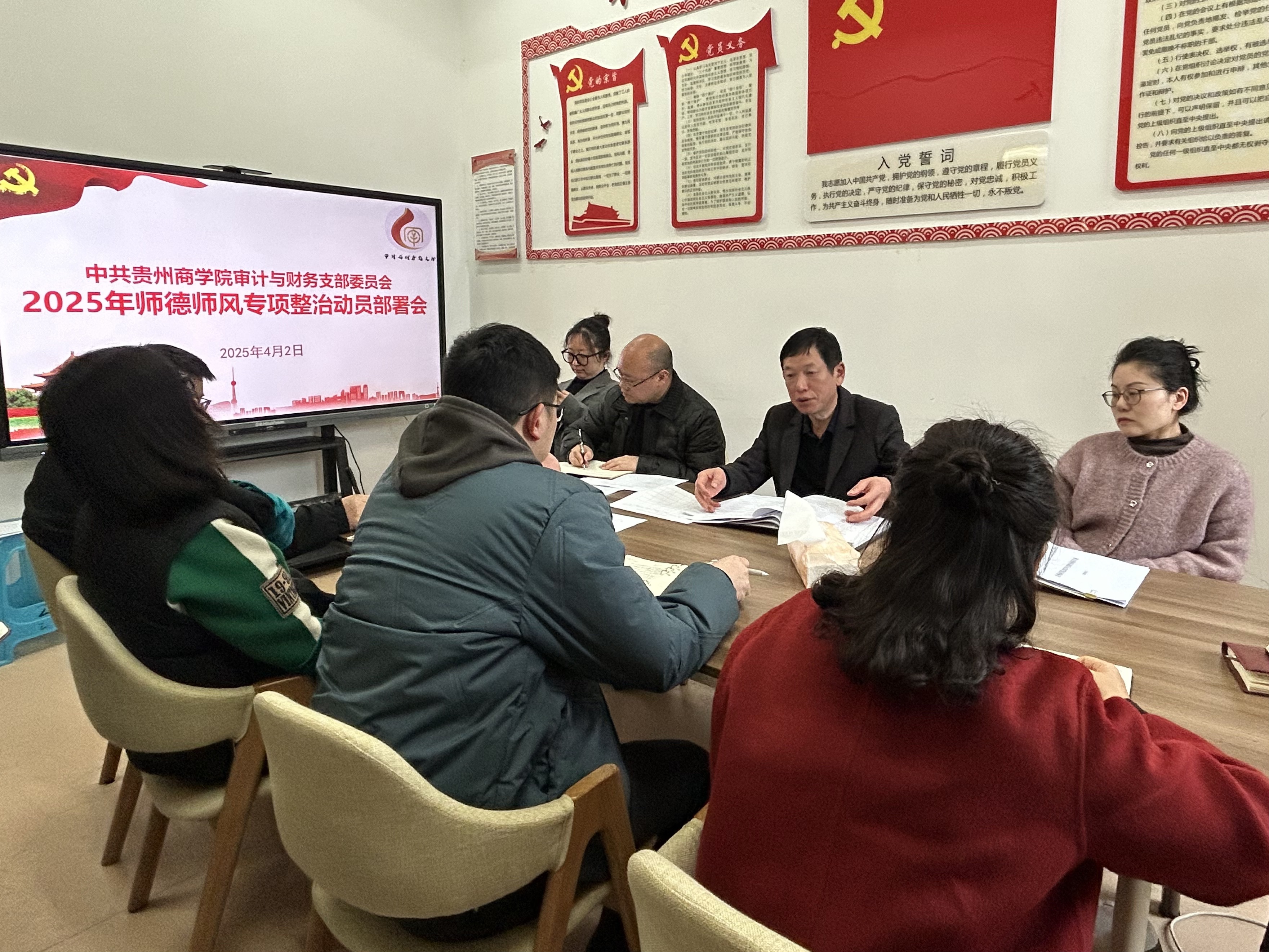 4月2日,审计与财务支部召开师德师风专项整治工作动员部署会。支部书记罗永军传达学习《贵州商学院2025年师德师风专项整治行动工作方案》。支部所属部门全体干部职工参加会议。