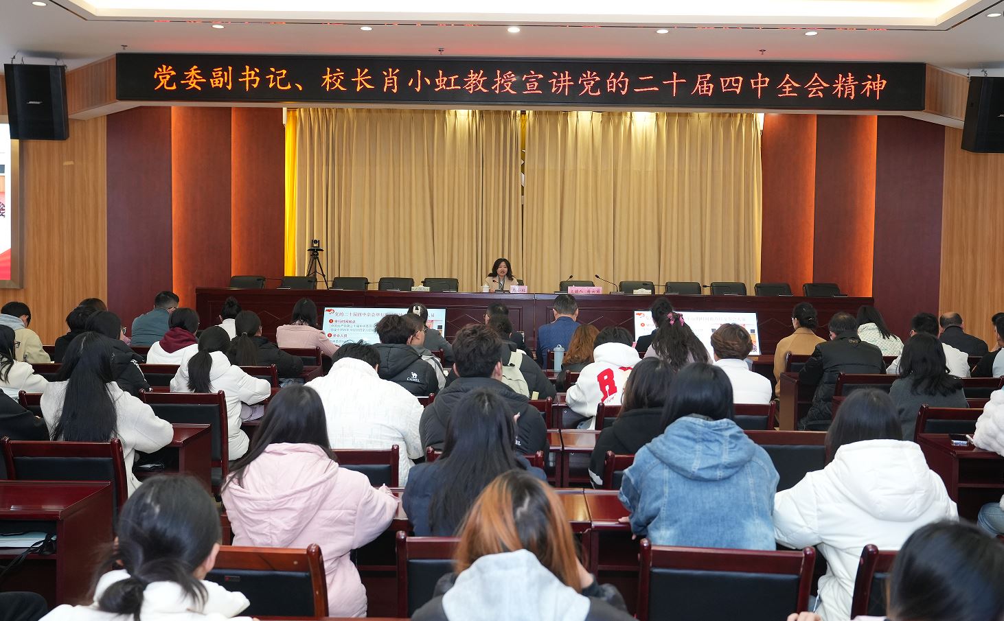 为推动党的二十届四中全会精神在校园落地生根、开花结果,切实把全校师生的思想和行动统一到党中央决策部署上来,11月11日,党委副书记、校长肖小虹教授在静心湖会议中心报告厅作深入学习贯彻党的二十届四中全会精神宣讲报告。宣讲会由党委副书记蒋云丽主持。
