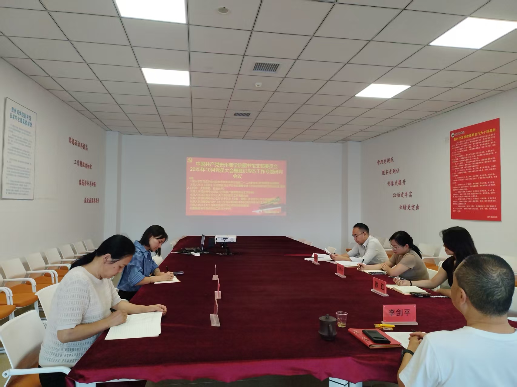 2025年10月17日,图书馆党支部在五楼会议室组织召开意识形态工作专题研判会议,党支部书记李剑平主持会议,全体党员参会。