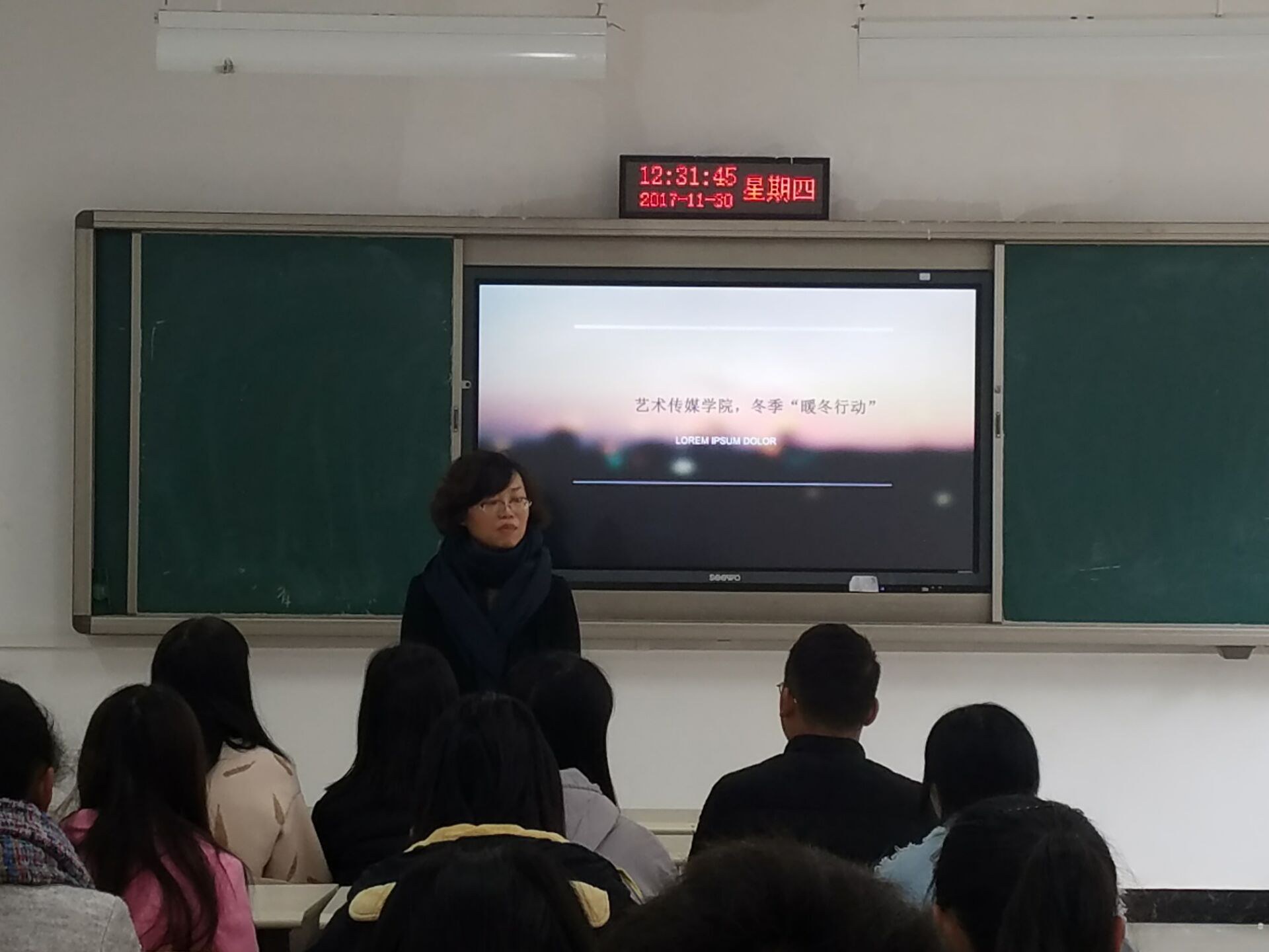 2017年12月1日,艺术传媒学院2017年“暖冬行动”棉被发放仪式在在尚文楼A208举行。院副书记龙孝华老师出席活动,院学工干事黄倩老师、辅导员及学生代表参加仪式。仪式由院资助工作负责人黄偶倩老师主持。