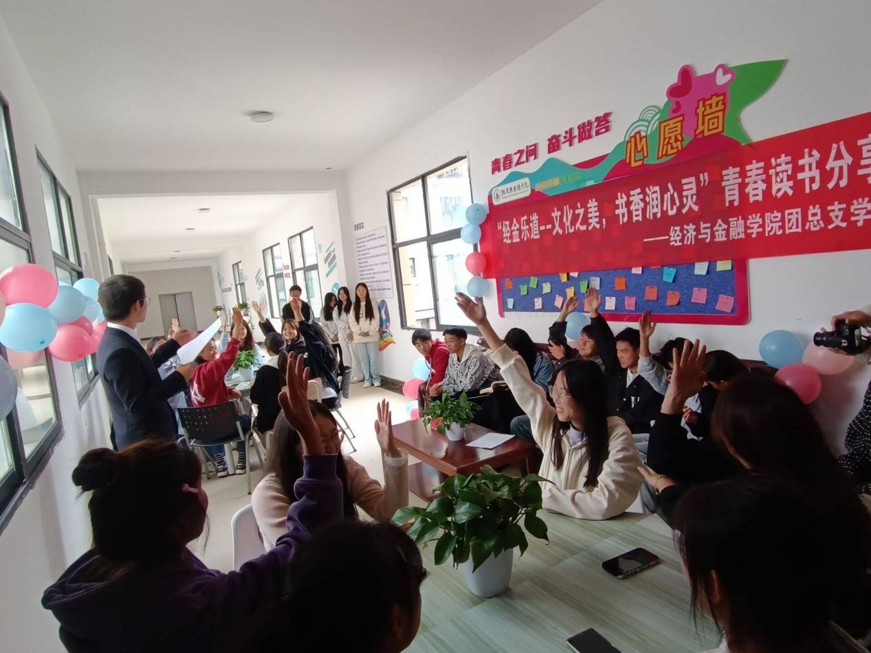 2024年10月7日,经济与金融学院团总支学生会于青桂苑学生社区成功举办了“经金乐道——文化之美,书香润心灵”青春读书分享会活动。本次活动吸引了保险学专业大一新生及学生会成员的积极参与,团总支书记邓书贤也亲临现场。