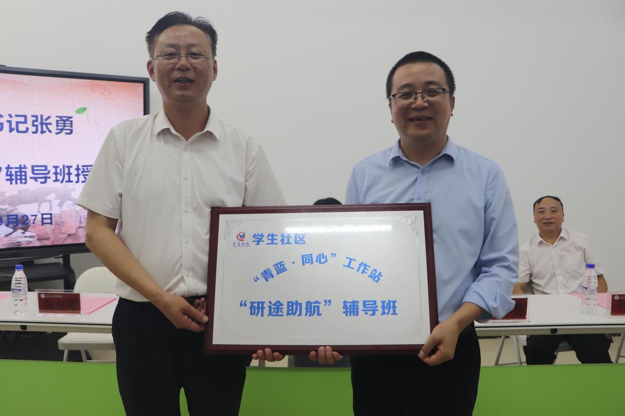仪式来到授牌环节。在热烈的掌声中,张勇为“研途助航”辅导班正式授牌,曾方俊接过授牌,这标志着“研途助航”辅导班正式成立。