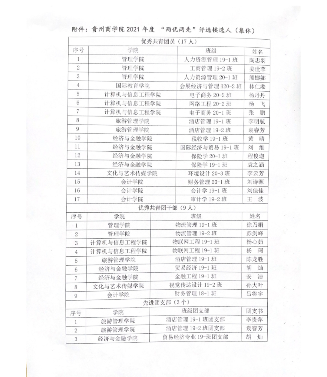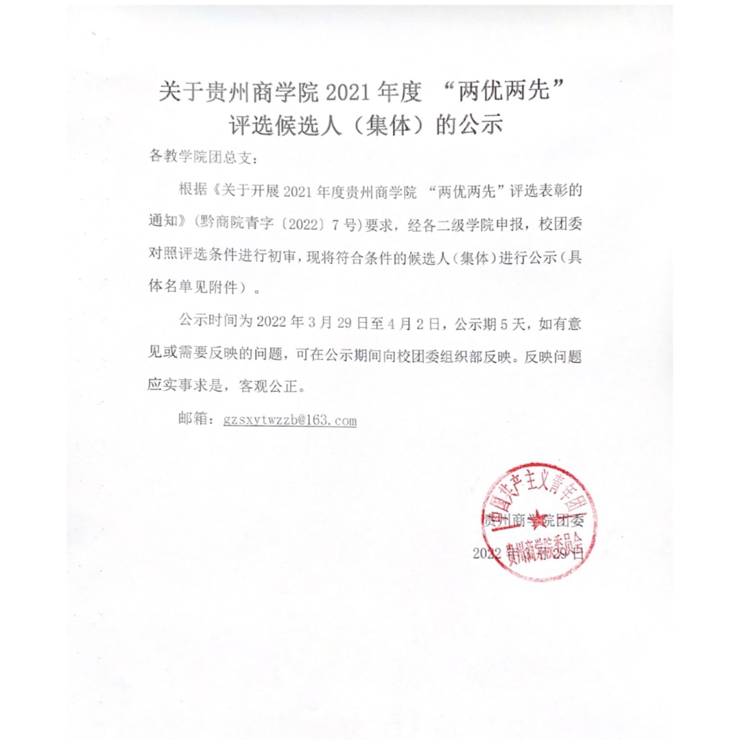 关于贵州商学院2021年度“两优两先” 评选候选人(集体)的公示