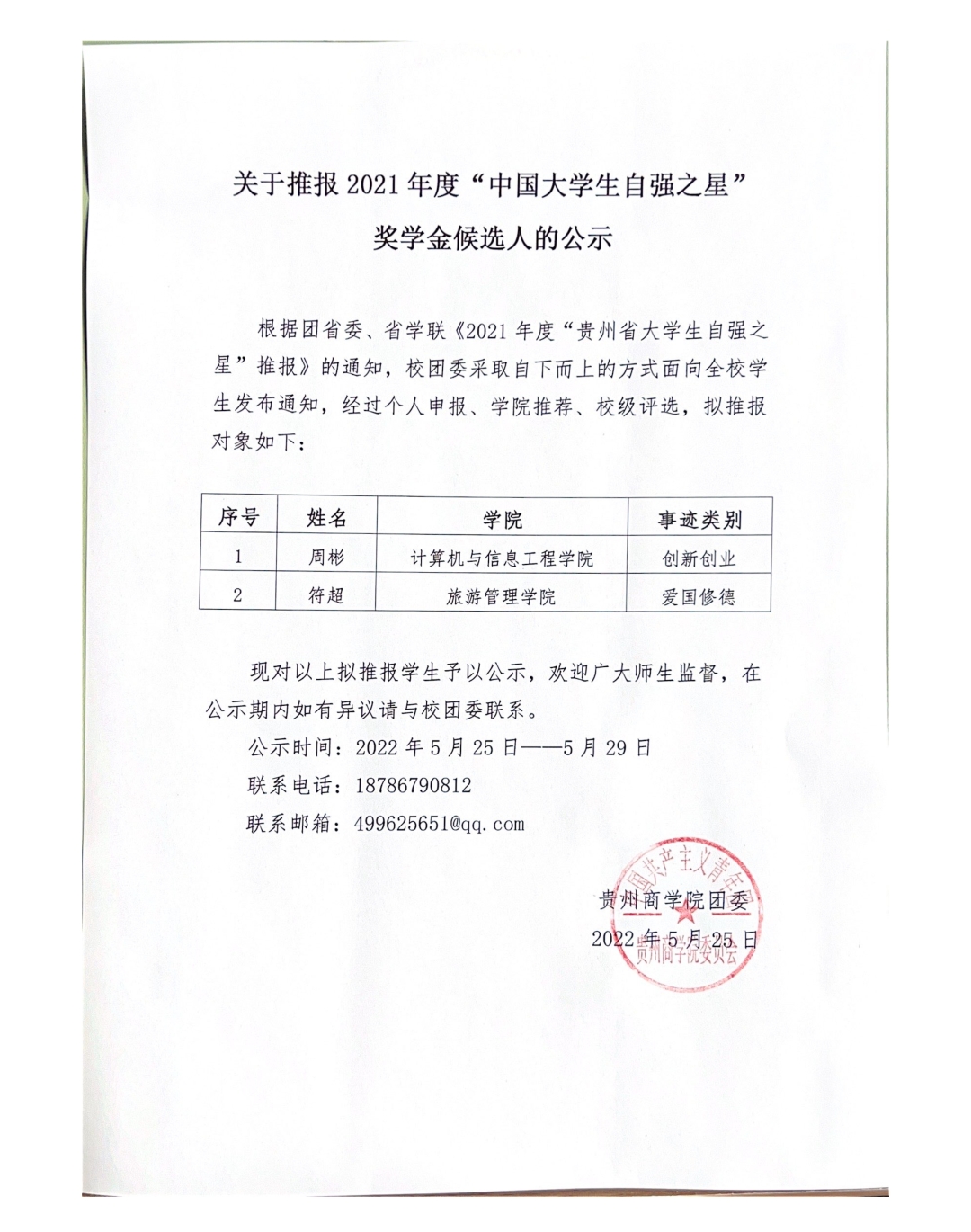 关于推报2021年度“中国大学生自强之星”奖学金候选人的公示