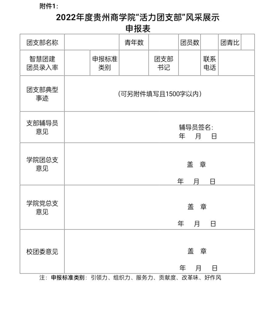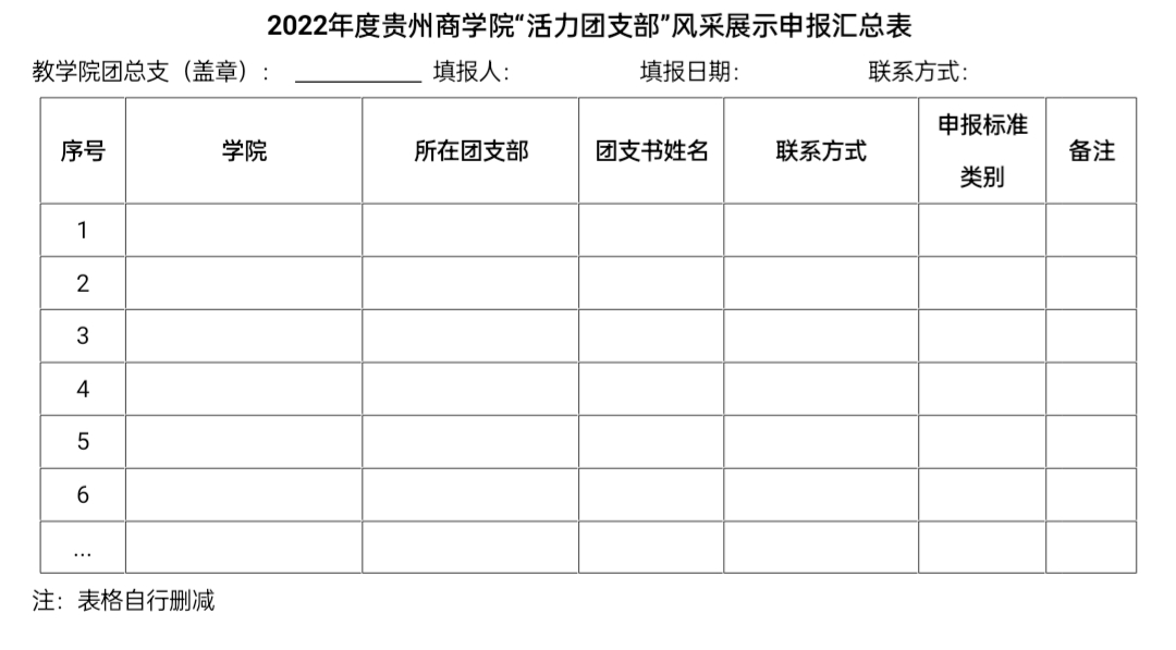 (二)强化组织,力求实效。以学院为单位,认真填写《2022年度贵州商学院“活力团支部”风采展示申报汇总表》(附件2)。并于2022年7月11日(周五)前,将附件1和附件2(电子版和纸质版)以及支部风采视频报送至校团委组织部。