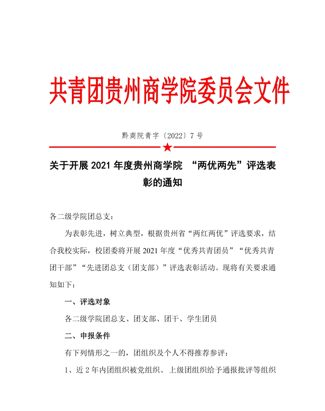黔商院青字〔2022〕7 号 关于开展 1 2021 院 年度贵州商学院 “ 两优两先 ” 评选表 彰的通知