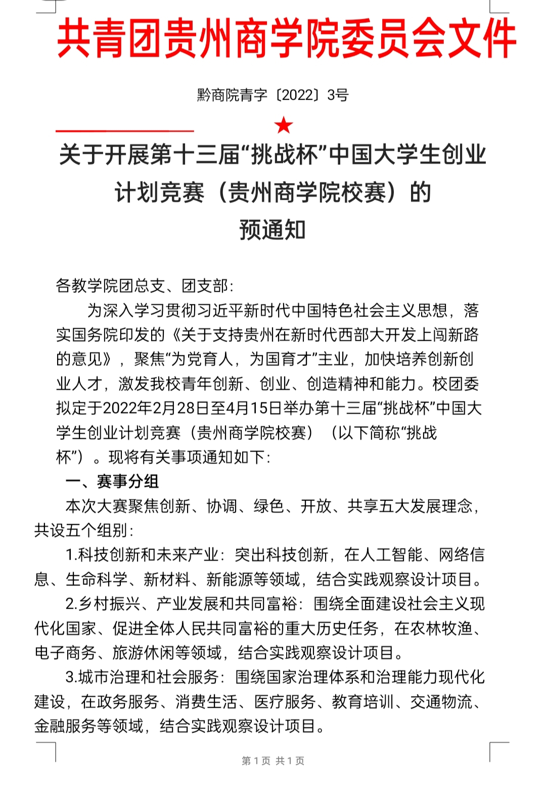 黔商院青字〔2022〕3号 关于开展第十三届“挑战杯”中国大学生创业计划竞赛(贵州商学院校赛)的 预通知