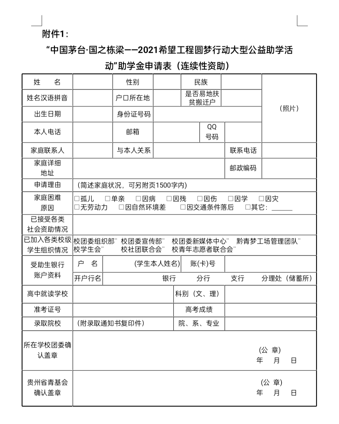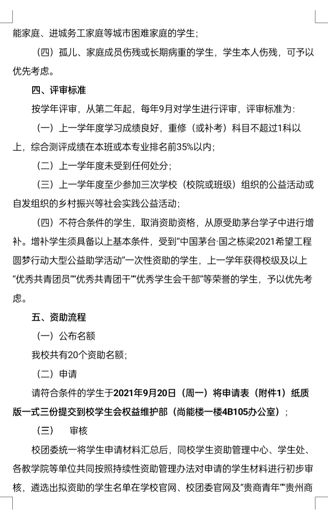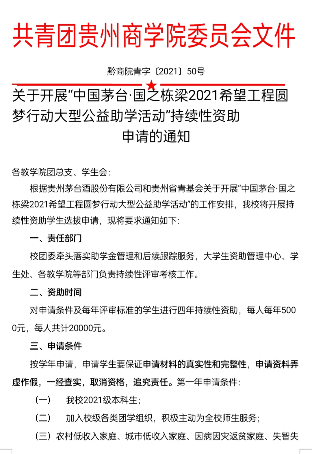 黔商院青字〔2021〕50号 关于开展“中国茅台·国之栋梁2021希望工程圆梦行动大型公益助学活动”持续性资助 申请的通知