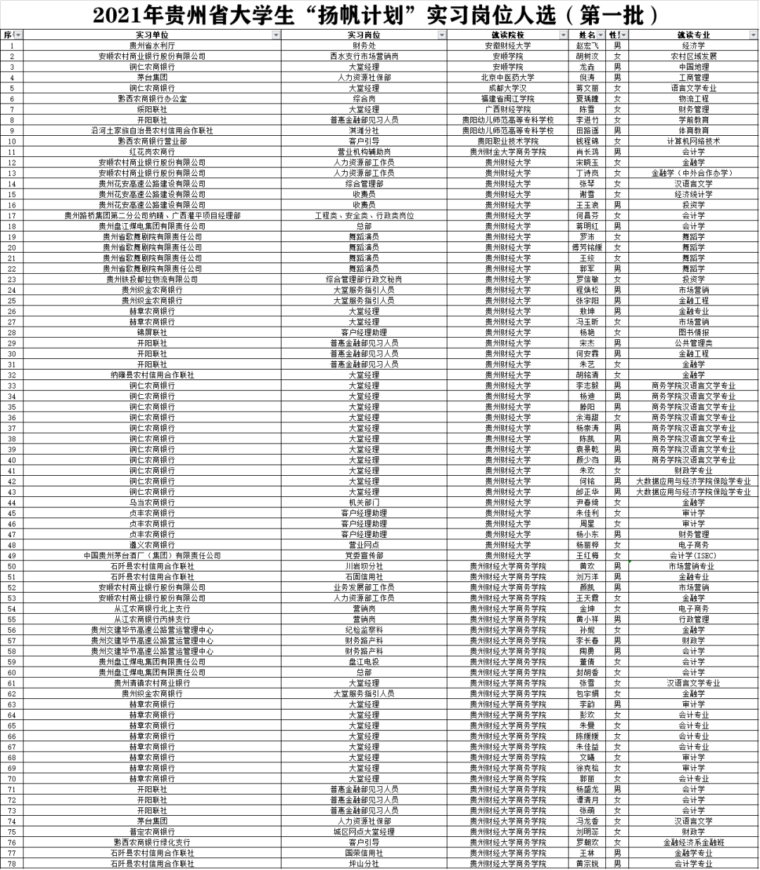 2021年贵州省大学生“扬帆计划”实习岗位人选第一批公示名单来咯~看完快去报到吧