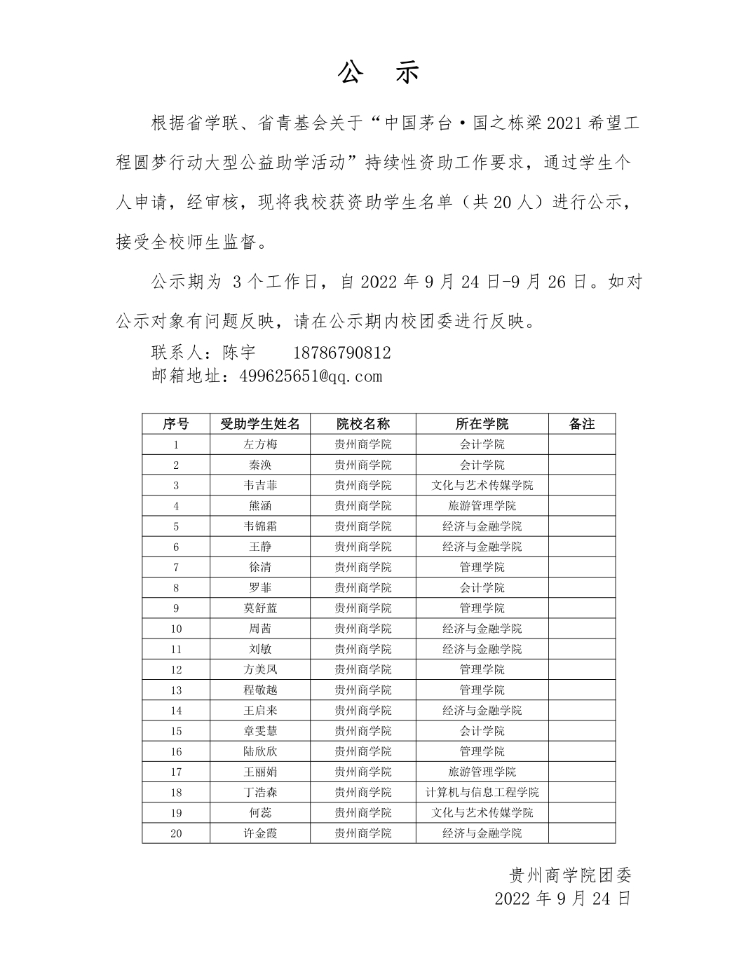【公示】2022年贵州商学院"中国茅台·国之栋梁2021希望工程圆梦行动大型公益助学活动"资助学生名单