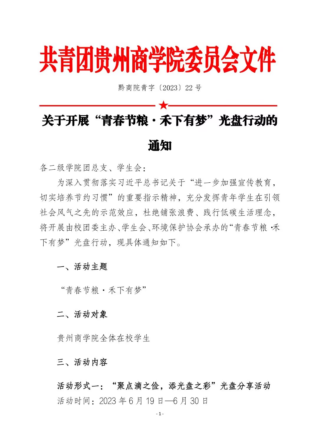 黔商院青字〔2023〕22号关于开展“青春节粮·禾下有梦”光盘行动的通知
