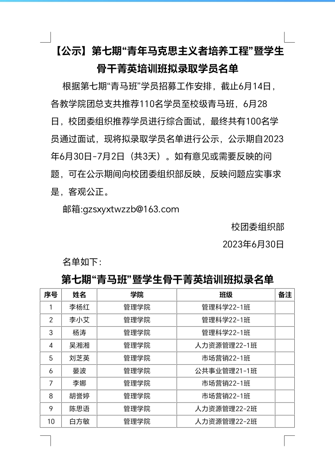 【公示】第七期“青年马克思主义者培养工程”暨学生骨干菁英培训班拟录取学员名单