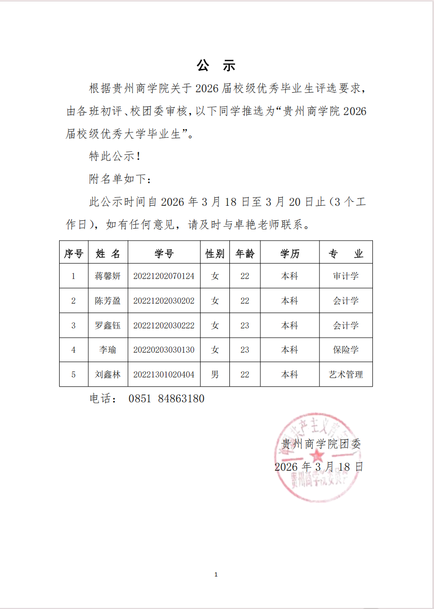 贵州商学院校团委2026届校级优秀毕业生公示